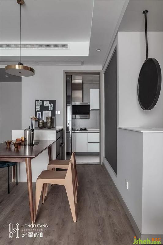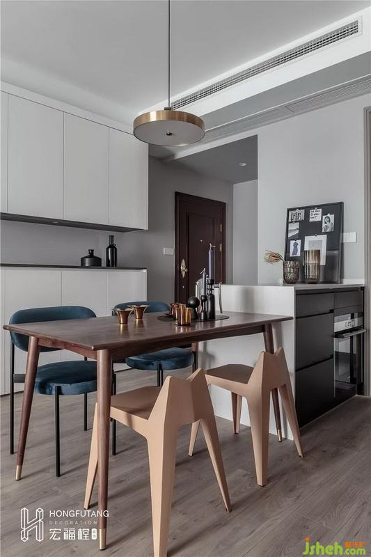餐廳與客廳在同一空間內(nèi),利用走廊將兩個空間自然分隔;餐廳增加島臺,以餐臺+餐桌的形式體現(xiàn),利用剩余空間增加了可操作區(qū)域,餐廳的關(guān)聯(lián)性更強;餐廳空間有限,為了不影響空間動線,在餐桌椅的選用上,選擇體態(tài)小,矮靠背的餐椅,藍色絲絨質(zhì)地的餐椅,舒適度強,提高空間格調(diào);餐廳位于進門左側(cè),右側(cè)設(shè)立頂天立地柜,可用作鞋柜和公共收納空間使用,選用中鏤空設(shè)計,從視覺上減少滿墻的呆板,鏤空位置也可作為進門放置物品和擺放收納使用;餐廳墻體選用磁性黑板漆,可以選用磁貼、便利貼、留言等形式作為家庭交流互動的區(qū)域,一面黑板,就包含了主人對于生活及情感互動的理解和理想。
