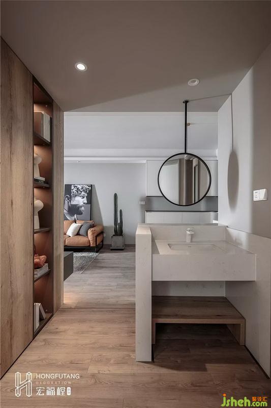 原始戶型中需要通過衛(wèi)生間進(jìn)入次臥,不僅影響使用,也不利于兩個(gè)空間布局,設(shè)計(jì)師將次臥入口獨(dú)立,由走廊空間直接進(jìn)入;衛(wèi)生間選用開放式干濕分離,將干區(qū)空間融入走廊及公共區(qū)域,增加客廳的視覺通透性和走廊的視覺舒適性,也不影響空間使用功能,滿足日常生活需求。
