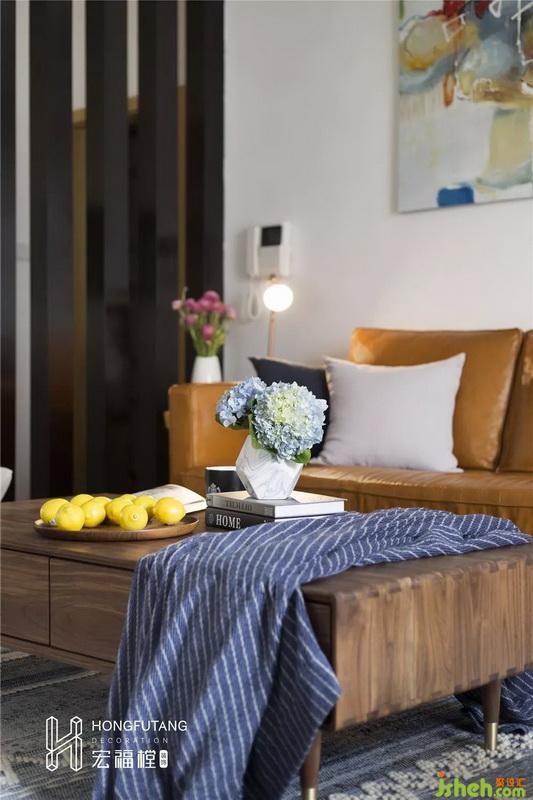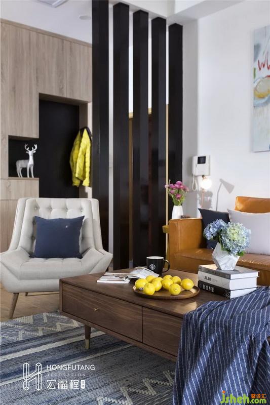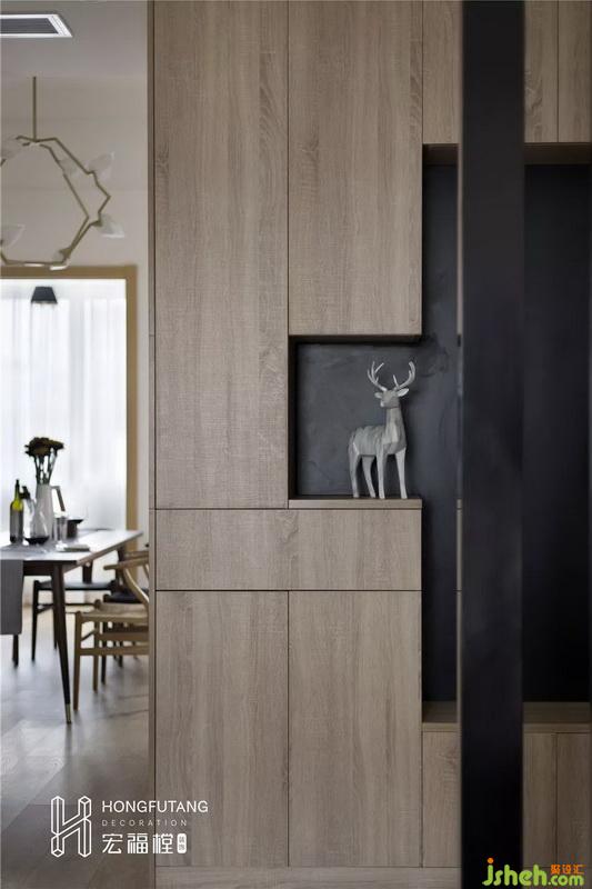 左側(cè)靠客廳空間選用木質(zhì)柵欄作為隔斷,起到分區(qū)作用,避免從客廳一眼望穿,保證空間一定的私密性,也不影響空間通透感,加強(qiáng)了入戶的空間感。