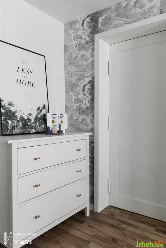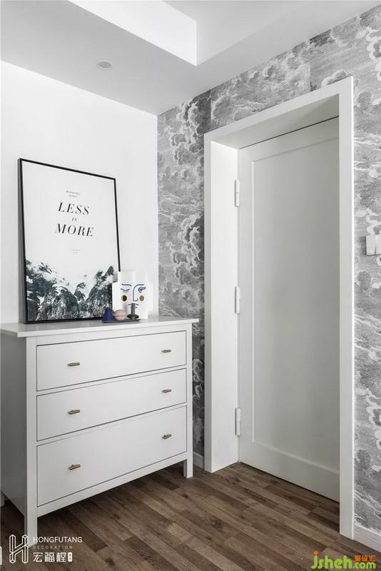 老人房位于客廳背后,將原有儲(chǔ)藏室與老人房合并,擴(kuò)大到15.5㎡,將原有的儲(chǔ)藏間的位置改造成開放式的衣帽間,因?yàn)閮?chǔ)藏間部分墻體是承重墻體,加之強(qiáng)電箱的位置也在墻體上,所以利用原有墻體的位置與新門洞隔墻的位置打造小景觀區(qū),放置斗柜,方便收納。