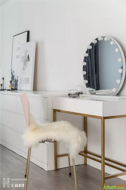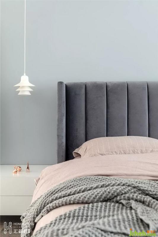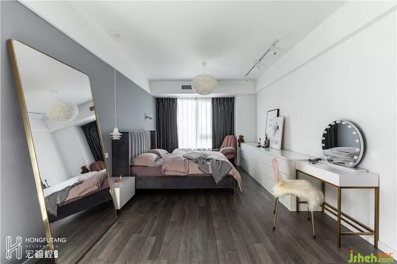 主臥空間色彩選用灰色搭配灰粉色,相比老人房更加溫柔,現(xiàn)代風(fēng)格融入其中;主臥內(nèi)選用的穿衣鏡、少女心梳妝臺(tái)都是女主人的喜好。