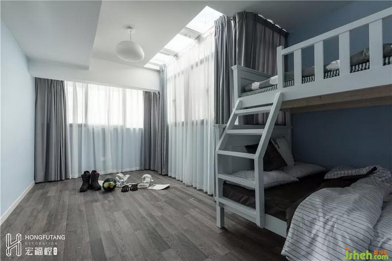 兒童房沒(méi)有擺放過(guò)多的家具,選用子母床,節(jié)約空間,剩余空間都可作為小朋友活動(dòng)玩耍區(qū)域。