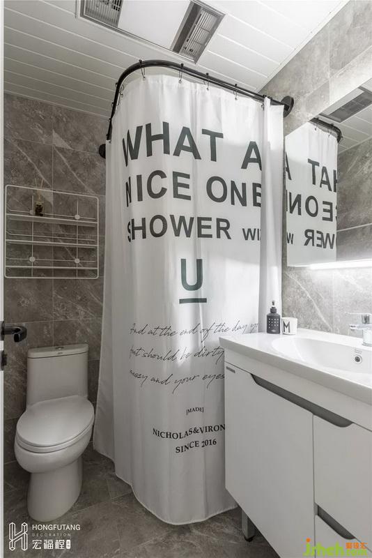 次衛(wèi)以暖灰色、空間白為主,現(xiàn)代風(fēng)格色彩較重,考慮到使用清潔衛(wèi)生,選用浴簾將衛(wèi)浴和洗漱空間隔離,次衛(wèi)使用度相對較低,所以相比主衛(wèi)更加簡潔,選用置物籃和洗漱臺放置用品,減少對次衛(wèi)空間的占用。