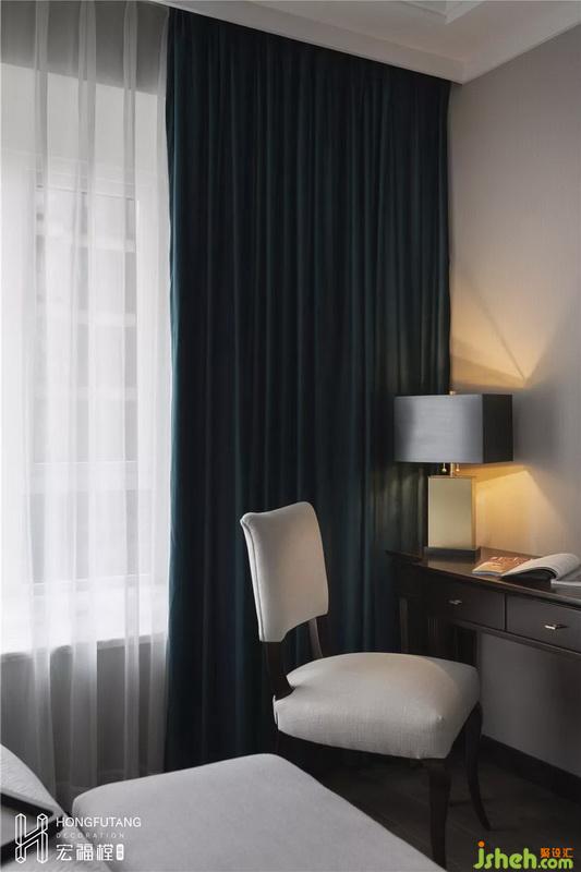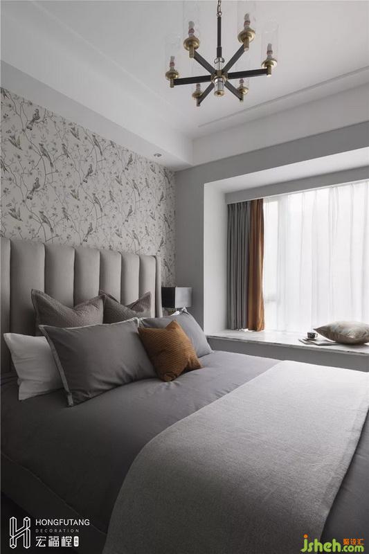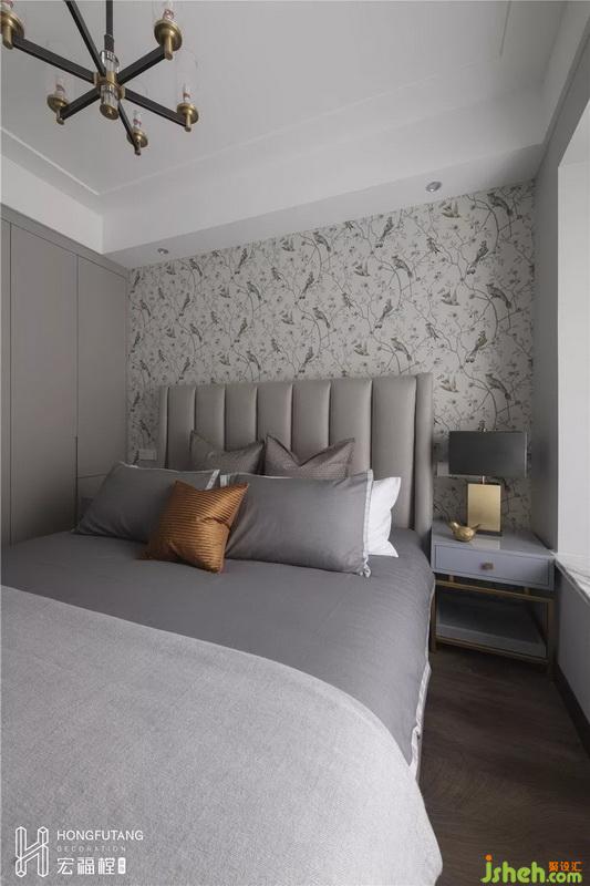 考慮到次臥主要為老人居住,所以顏色風(fēng)格溫和,選用花鳥壁紙,為整個(gè)空間帶來(lái)生氣;選用土秋香這種熱烈的顏色小面積出現(xiàn)在軟裝處,提亮空間色彩;床頭選用軟包皮質(zhì),符合人體感知度,老人使用時(shí)更加舒適,減少磕碰。