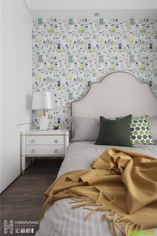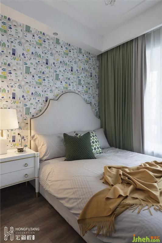 兒童房空間有限,所以一側(cè)靠窗邊擺放,節(jié)約空間;矮床的選用,減少小朋友摔下床的安全隱患;童趣壁紙活躍空間背景,軟裝選用綠色,空間更有生機(jī)活力。