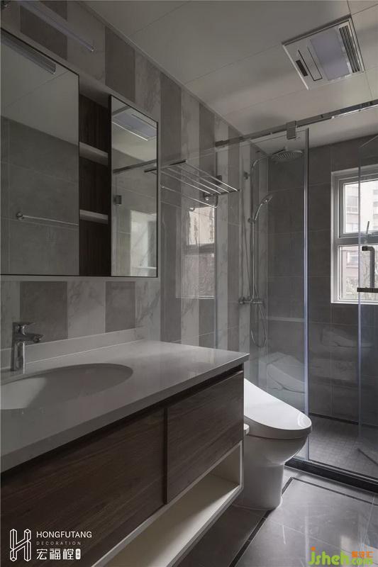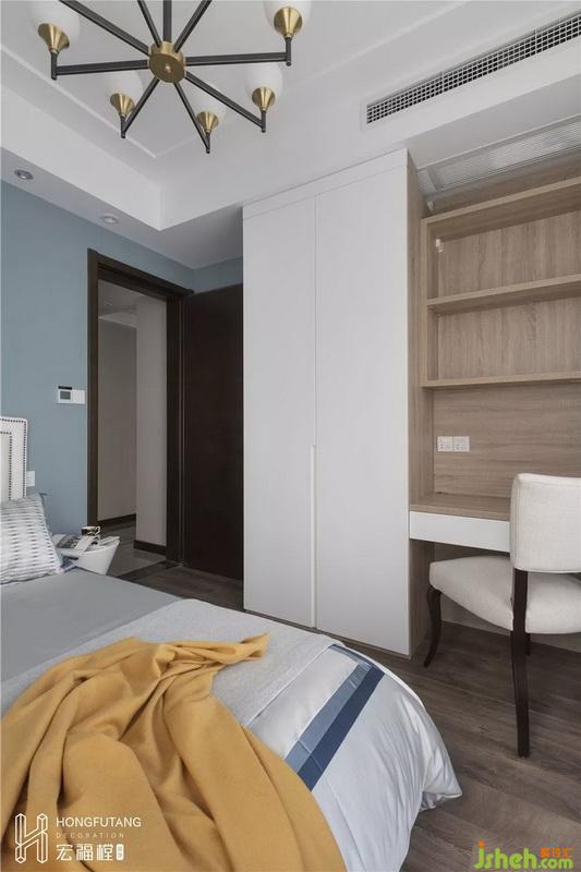 書房也可作為客房使用,依灰藍(lán)色墻面為主,利于空間的采光;書桌和衣柜采用一體式,滿足日常辦公、學(xué)習(xí)的同時(shí),也能書籍收納、衣物收納的功能。