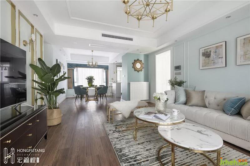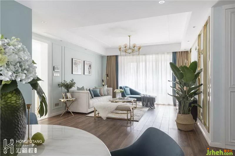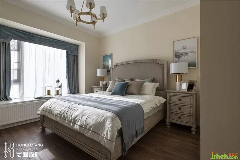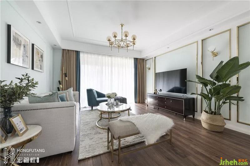 空間的立體感體現(xiàn)在墻面線條、家具桌角、以及落地?zé)?,?xì)節(jié)展示混合美式的溫馨與輕奢的質(zhì)感。