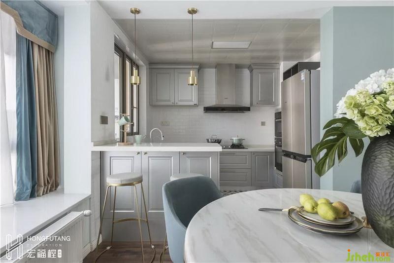 廚房原始較為封閉,與業(yè)主溝通后將廚房做成開(kāi)放式,將廚房空間延展開(kāi),增添了廚房的光線,同時(shí)在左側(cè)增設(shè)1200*550的吧臺(tái),滿足了業(yè)主的需求,吧臺(tái)的運(yùn)用也提供了更多的食材操作空間,增加家人之間的情感交流。