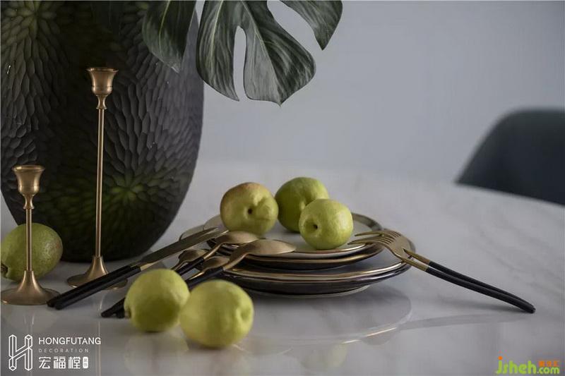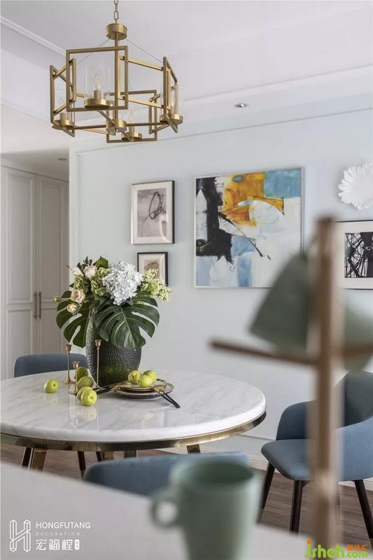 餐廳正對(duì)廚房,在一個(gè)過(guò)于方正的空間內(nèi),選用圓形餐桌可以柔化方正空間的硬朗棱角;餐桌椅材質(zhì)選用延續(xù)客廳家具風(fēng)格,蔚藍(lán)色餐椅作為深色出現(xiàn),餐廳空間顏色深淺搭配,突出空間重心。