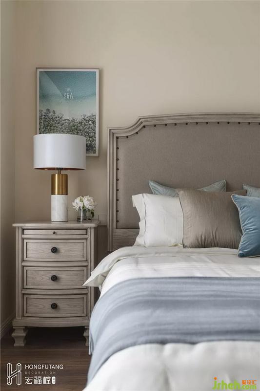 主臥空間選用米黃色墻面,色調(diào)溫馨自然,符合人體視覺(jué)感知;家具選用木紋質(zhì)感,提升空間品質(zhì);選用霧霾藍(lán)作為軟裝色系出現(xiàn),臥室空間氛圍沉靜、溫柔。