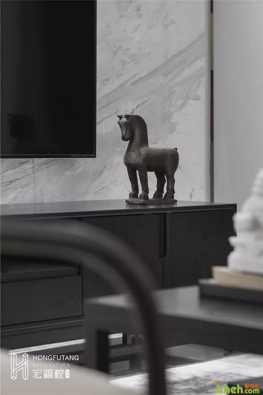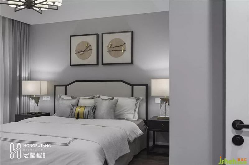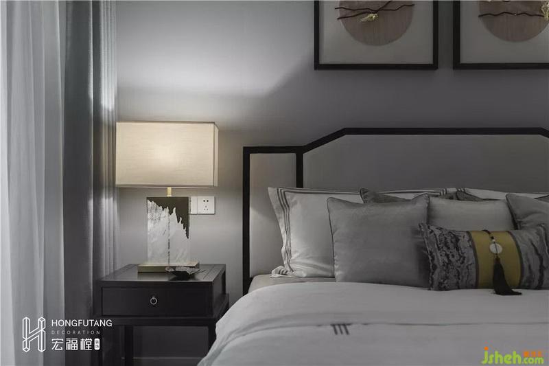 高級灰的采用會使得臥室空間清靜穩(wěn)重,燙金明黃等顏色作為軟裝出現(xiàn),調(diào)和空間色彩,更顯生機;床頭、床頭柜、壁畫、燈具都選用黑色線條包邊,讓整個空間視覺呈現(xiàn)更加清晰,也滿足中國古代條理有致的思維。