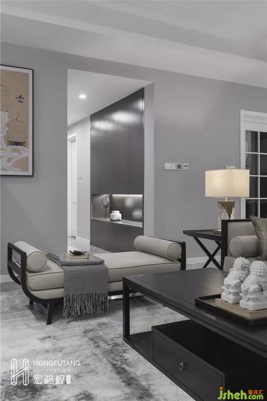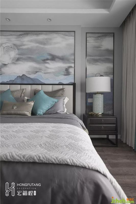 主臥吊頂設(shè)計使得視覺空間更加開闊,延續(xù)高級灰主色調(diào),選用天水碧和沙青兩種中式色彩作為軟裝調(diào)和單色帶來的孤獨感;家具擺件線條明朗紋理清晰,體現(xiàn)中式風(fēng)格的內(nèi)斂、莊嚴、優(yōu)雅、質(zhì)樸,直線裝飾線條體現(xiàn)現(xiàn)代人追求簡單生活的居住氛圍,更迎合了現(xiàn)代氣息,臥室空間更加實用,富有現(xiàn)代色彩;床頭背景采用絲綢定制墻畫,比山水畫更加溫柔,提高空間質(zhì)感。