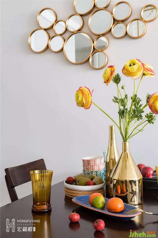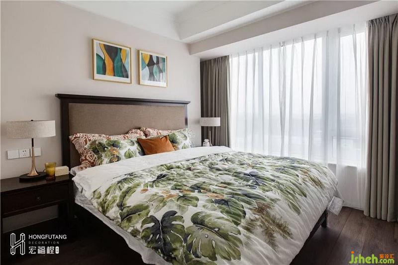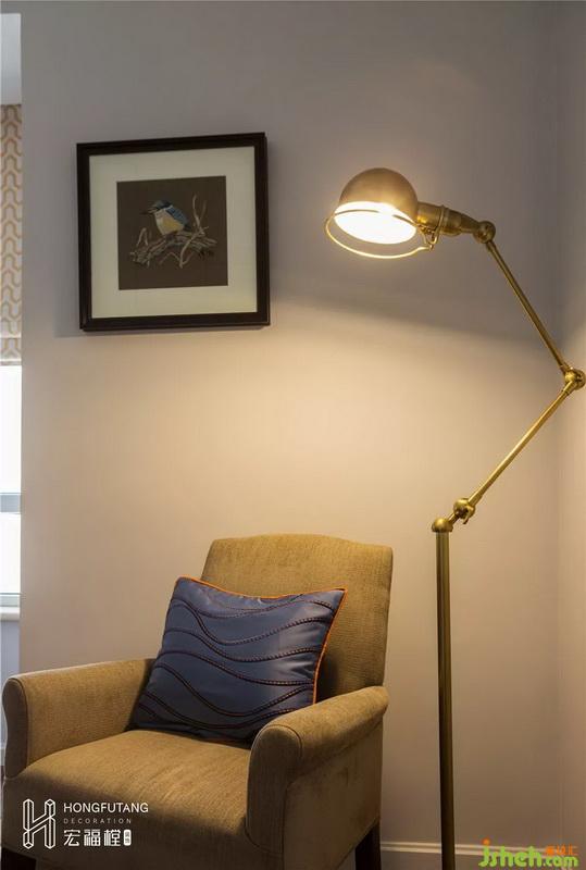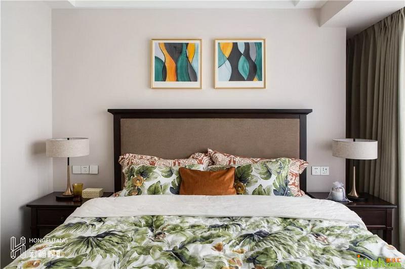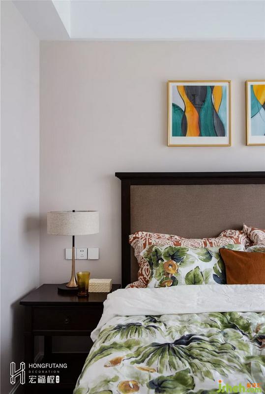 主臥選用典型美式搭配色彩米金咖作為主色,用綠色和橘色增添空間活力。這是源于臥室空間寧?kù)o的環(huán)境氛圍,選用低明度色彩更利于臥室空間打造,用小范圍的亮色提亮部分空間明度,也不會(huì)顯得過(guò)于沉悶。