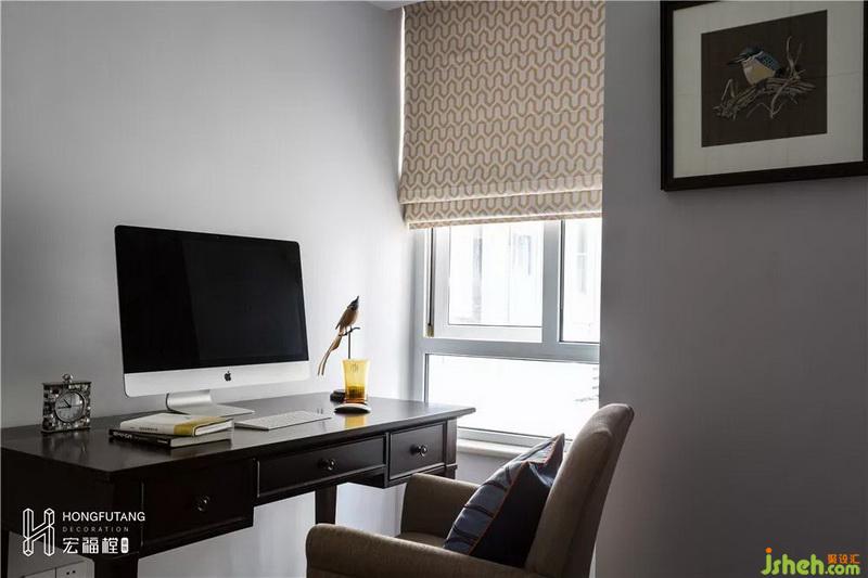 書桌靠近窗邊陳列,利于辦公采光??紤]到日后要將書房改造為兒童房使用,目前書房采用活動(dòng)家具,便于移動(dòng)更替。