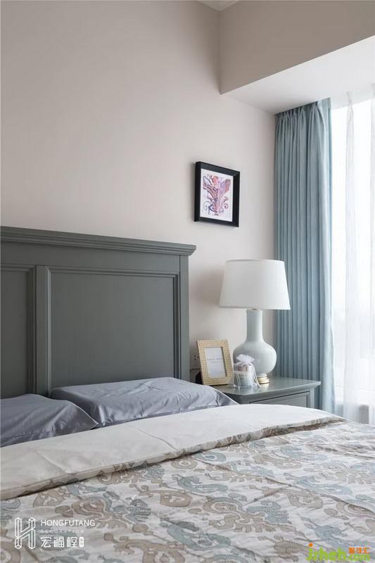 次臥選用灰藍(lán)色作為主色調(diào),空間寧?kù)o清新。