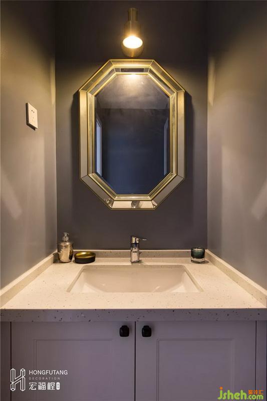 干區(qū)空間面積壓縮,所以在設(shè)計(jì)時(shí)以簡(jiǎn)潔為主,不需要設(shè)立太多裝飾,帶有柜子的洗手臺(tái)就能解決大部分收納問(wèn)題,也使得干區(qū)空間整潔有條理;選用六邊形鏡子,使得小空間更加靈動(dòng)不壓抑。
