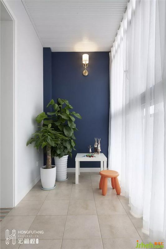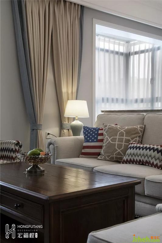 客廳選用米白色沙發(fā)搭配胡桃木家具,一深一淺的搭配使得視覺(jué)空間有重點(diǎn);電視背景墻選用線條包邊設(shè)計(jì),墻體凹凸?fàn)睿S富墻面,更有層次感;在主色調(diào)上都過(guò)于清淡,所以選用霧霾藍(lán)搭配米黃色窗簾、畫作來(lái)增添空間色彩,這兩個(gè)色系也使得空間更加清新,有活力;客廳旁陽(yáng)臺(tái)可放置女兒日常玩具,用作親子空間使用,靈活家庭活動(dòng)空間。