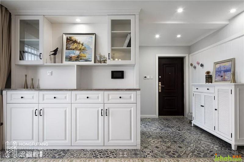 玄關(guān)空間局促,不能滿足基本的收納功能,在降低功能改造的情況下,通過(guò)吊頂和地面貼磚分區(qū)延伸了玄關(guān)空間,由此可以留出鞋柜的位置,從視覺(jué)上來(lái)說(shuō),入戶所見(jiàn)空間更加開(kāi)闊。