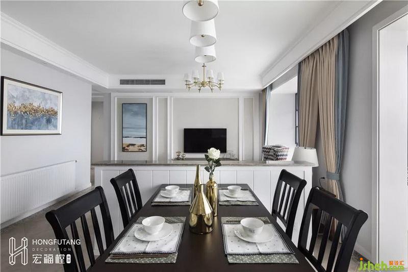 客餐廳為連接一體的長(zhǎng)廳,整體尺寸比較緊張,在對(duì)兩個(gè)區(qū)域劃分功能空間時(shí),會(huì)受到空間整體布局的影響,所以在客廳與餐廳中間做了一面1.2米高的裝飾隔墻,以此來(lái)分割客餐廳空間。