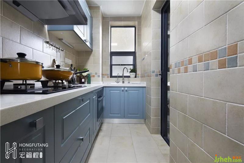 廚房延續(xù)客廳風(fēng)格,選用霧霾藍(lán)搭配米黃色,統(tǒng)一空間調(diào)性。廚房空間有限,根據(jù)空間格局,選擇L型櫥柜能最大利用有限空間。