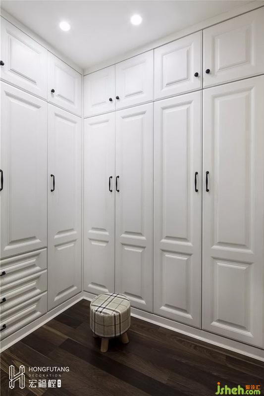 考慮到主臥原始收納空間不足,將主衛(wèi)生間改造成衣帽間,面積由3.8㎡擴大到5.3㎡,可滿足業(yè)主日常收納需求;還將衣帽間的入口做成斜面,斜面的采用可以在增加衣帽間的面積的同時擴大臥室空間感。且斜面預(yù)留出的空間,還能增加一組斗柜,用作日常儲物使用。