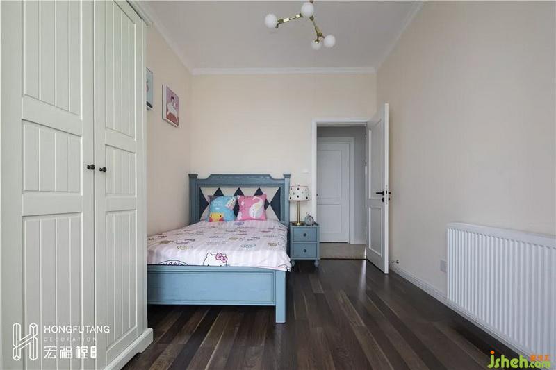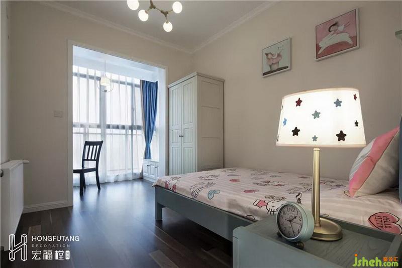 兒童房形狀偏長,門開在右側(cè)邊角,所以將床往左靠墻擺放,進(jìn)門視線更開闊,選用粉藍(lán)粉紅滿足女兒的童話公主夢;選用活動家具,左側(cè)書桌,右側(cè)矮柜,動線更流暢,便于小朋友活動,視野更加開闊,也便于日后移動更替。