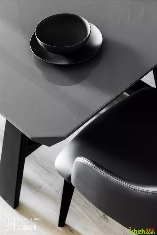 餐廳選用深灰家具搭配左側(cè)青灰墻面,灰色的運(yùn)用提高了餐廳空間質(zhì)感,現(xiàn)代感更加強(qiáng)烈。餐桌對(duì)面設(shè)計(jì)懸空掛式壁柜,上方可作為陳列區(qū)和小家電使用區(qū),左邊封閉柜子作為收納區(qū),右邊兩格作為酒具放置區(qū),采用這樣半封閉的樣式,避免了視覺(jué)呆板。