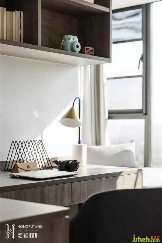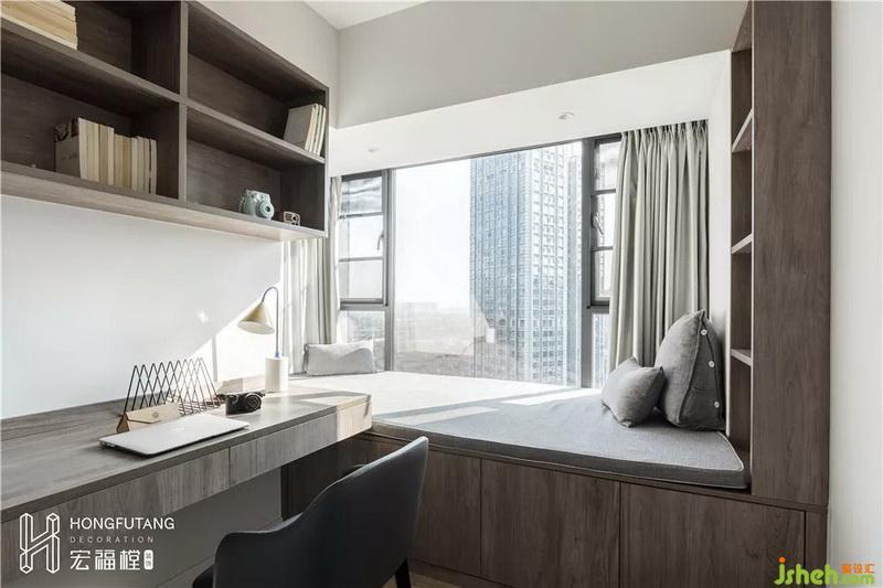 書房飄窗加寬,采用榻榻米形式,右側(cè)設(shè)立半封閉收納柜,可作為擺件的放置區(qū),榻榻米下方也有足夠的收納空間放置不常用物品,使得空間更加整潔;榻榻米的采用一是可作為業(yè)主偶爾工作放松區(qū)域、閱讀區(qū),二是可以用作客人留宿使用。
