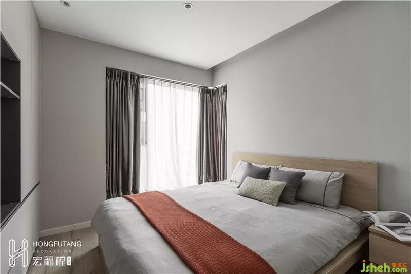 主臥空間低調(diào)柔和的配色與木質(zhì)家具,營(yíng)造休息空間的簡(jiǎn)凈高尚。無(wú)色調(diào)的空間搭配有色調(diào)的姜橙色床毯,打破了空間的單調(diào)感,為主臥增添了更多的溫馨舒適感。