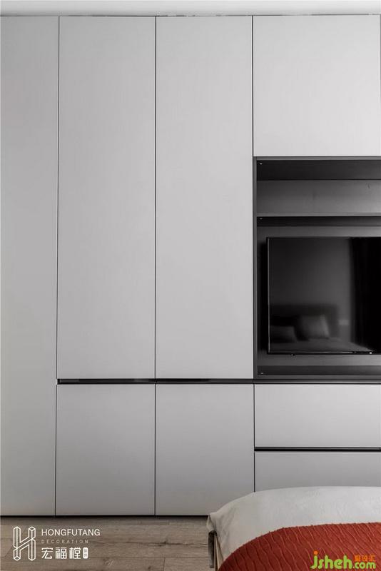 業(yè)主希望能躺在臥室床上,用大大的電視看著肥皂劇享受睡前的時(shí)光,加之女主人希望的收納空間,設(shè)計(jì)師將衣柜和電視墻融入一體,將電視嵌入衣柜內(nèi),最大限度擴(kuò)大了臥室的收納空間,也為電視留出一席之地,衣柜在此運(yùn)用,也減少了電視墻的打造工序。