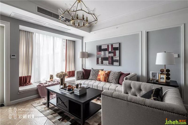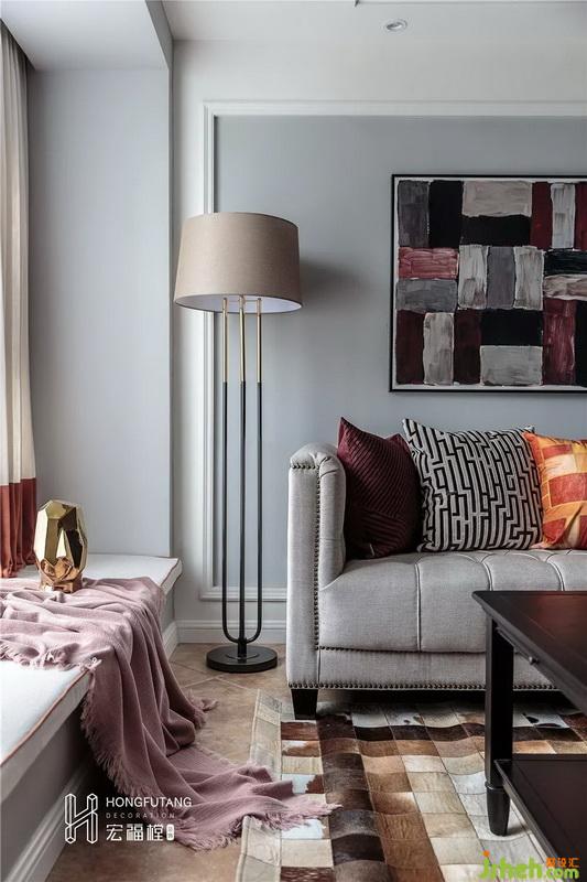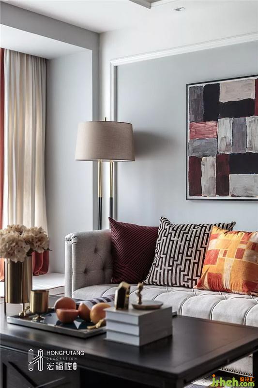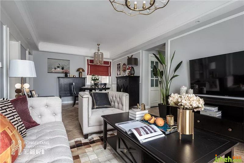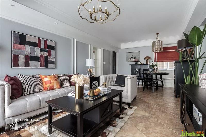 客廳裝修以灰黃搭配,美式風(fēng)格的典型代表,選用黑色家具穩(wěn)住空間顏色,軟裝采用紅、橙、棕色來(lái)搭配客廳空間,暖色系的使用使得整個(gè)空間更加愉悅、溫暖。
