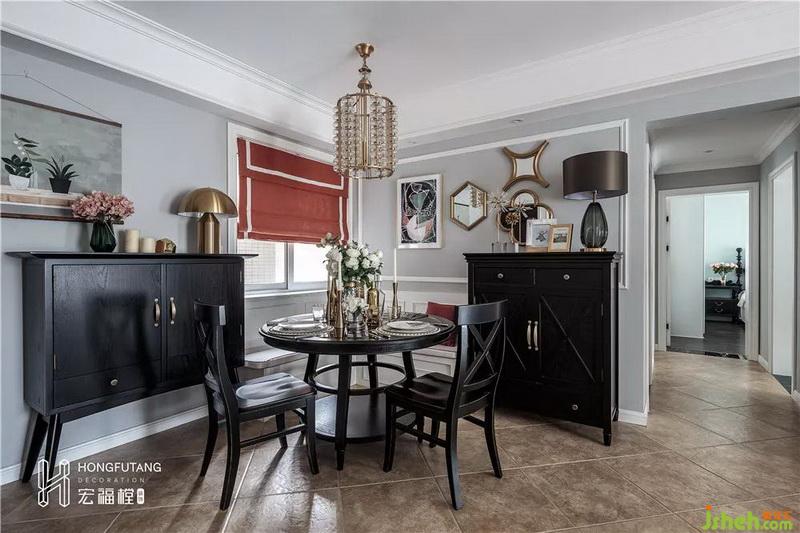 餐廳面積較大,考慮到常駐人口少和使用頻率相對(duì)較低,設(shè)計(jì)公司沒(méi)有選用過(guò)大的餐桌椅。選取餐廳窗臺(tái)一角做成轉(zhuǎn)角卡座形式,卡座的設(shè)置可容納多人,這樣的設(shè)計(jì)能減少餐椅對(duì)空間的占用,臨窗而設(shè)用餐區(qū)光線更加明朗,提高用餐體驗(yàn);還有未使用的餐廳空間,擺放兩個(gè)斗柜,一是能作為空間陳設(shè)使用,二是增加收納空間,用作物品收到和擺件展示區(qū),合理利用餐廳空間,加之配以墻上裝飾,將餐廳打造成用餐、美學(xué)展示集合區(qū),選用紅色窗簾作為整個(gè)空間軟裝主色,活躍空間,別有美式風(fēng)情。