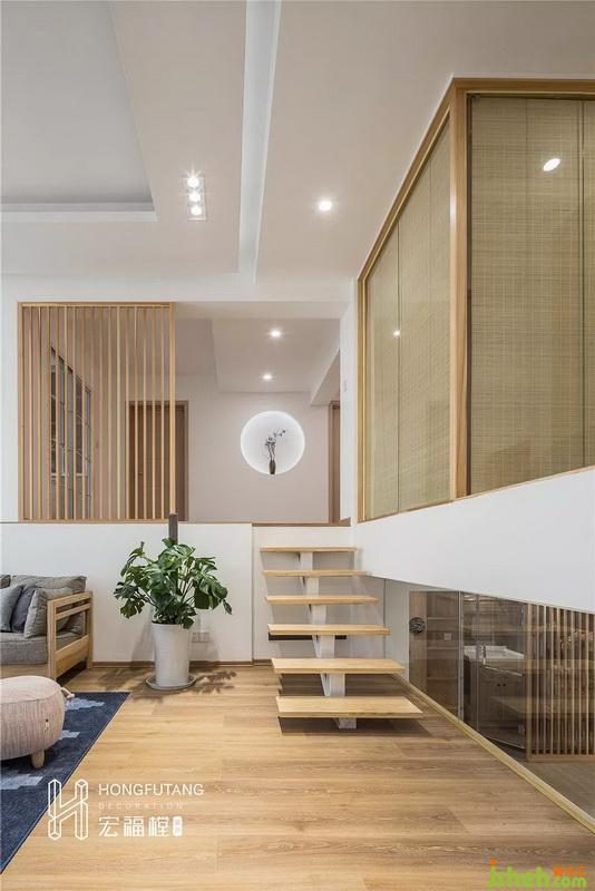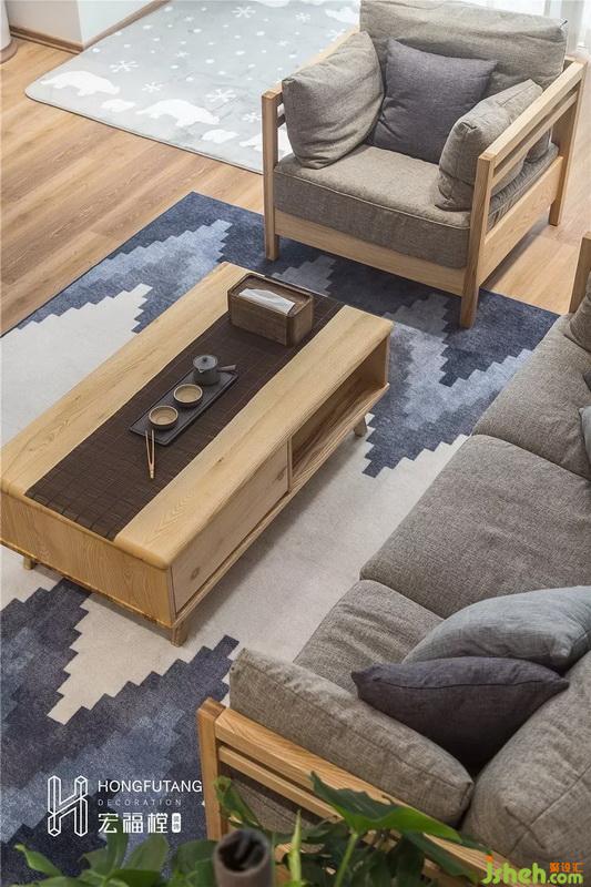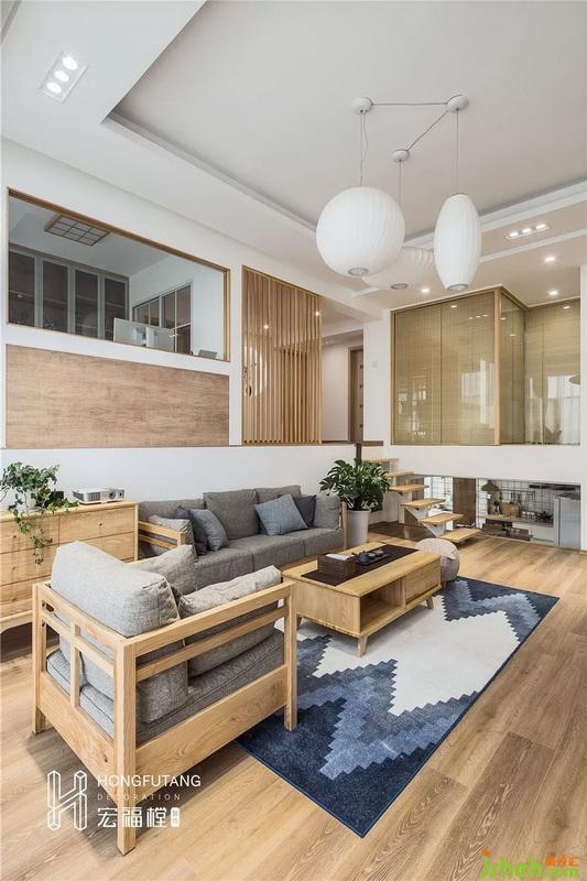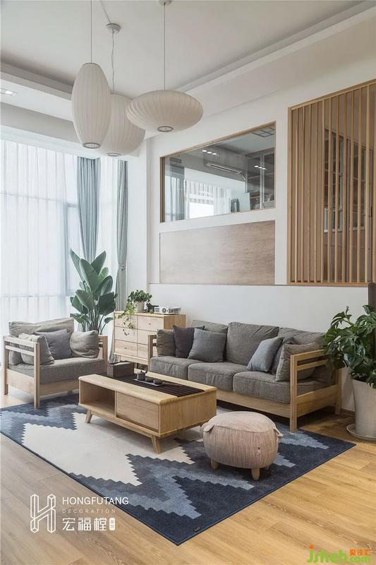 客廳用冷色調(diào)搭配原木色家具,沙發(fā)色彩是簡單的麻質(zhì)灰,低純度的色系干凈利落。選擇漸變藍(lán)地毯彌補(bǔ)小面積茶幾帶來的視覺空白;摒棄傳統(tǒng)電視,采用投影,視覺上擴(kuò)大感官,減少電視對空間的占用;客廳上方選用拇指柵欄隔離二樓公共區(qū)域,一是可以保障安全,避免從樓上摔下,二是木質(zhì)柵欄相比其他隔斷更通透;木質(zhì)樓梯清新簡潔,整個客廳沒有過多的裝飾,秉承了日式的簡約實(shí)用性。