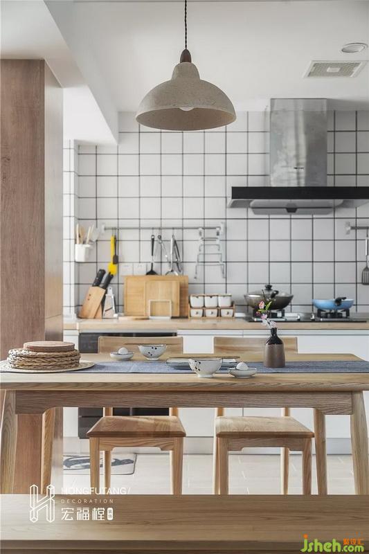 餐廳與廚房一體,打造開放式的烹飪就餐空間,明亮寬敞,開放式廚房更能增添家人間的情感聯(lián)絡(luò);餐廳右側(cè)用柵欄分隔洗衣房和晾衣空間,可以遮擋一些生活用品,提高美觀度;因業(yè)主需求,隱藏多余的物品,櫥柜數(shù)量增加;餐椅選用橫凳搭配兩把椅子,橫凳沒有椅背使得視線更開闊,餐廳柱子的出現(xiàn)會影響橫凳的擺放,所以對面選用椅子,更好的調(diào)節(jié)空間。