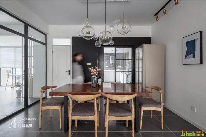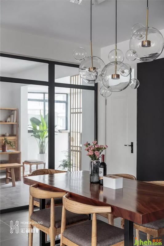 餐廳左側(cè)墻體拆除,選用玻璃隔斷將其與書房隔開,玻璃隔斷的采用使得餐廳采光更好,空間更加通透,右側(cè)采用軌道燈平衡餐廳燈光;座椅選用原木軟座使得用餐體驗感更加舒適;依靠廚房的墻面色彩選用黑色,是日式風格向北歐風格的過度,也將整個空間的重心突出,避免了大白墻的空白。