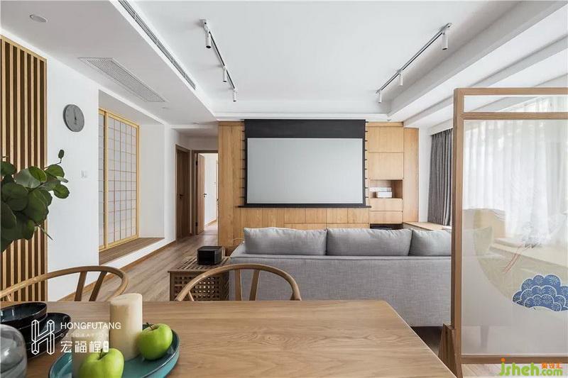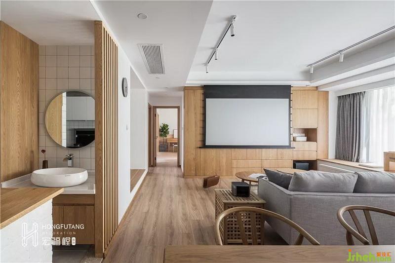 橫廳室內(nèi)設(shè)計(jì)師采用吊頂設(shè)計(jì),使得整個(gè)空間組合看起來更大。客廳背景墻采用原木木板材質(zhì),搭配投影屏幕,選用這樣的設(shè)計(jì)有兩個(gè)好處。一是在屏幕收起時(shí),避免大白墻帶來的空白感,二是選用木板搭建半封閉半開放的收納空間,封閉空間作為不常用物品收納區(qū),開放空間作為書籍、擺件展示區(qū)。這樣的設(shè)計(jì)層次分明,避免滿柜帶來的呆板,也減少了清潔的難度,增添了收納空間。