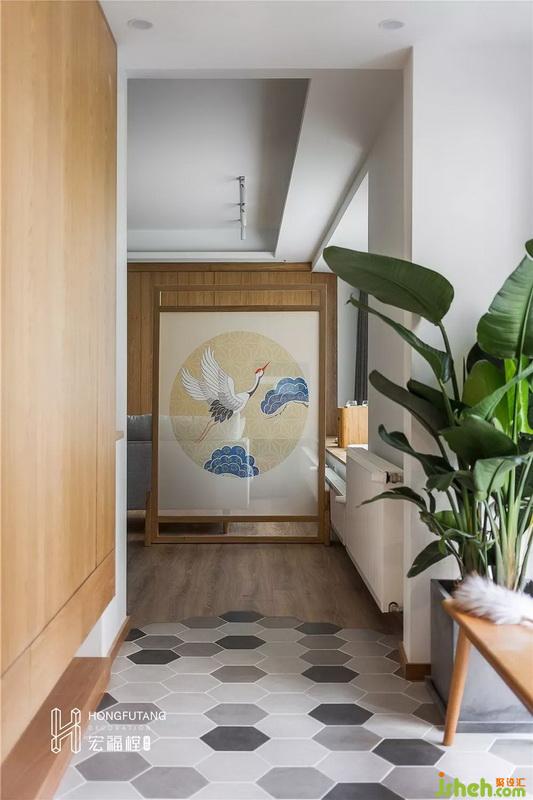 為避免從玄關(guān)處一眼望盡,在玄關(guān)處設(shè)立和風(fēng)屏風(fēng),符合整個(gè)空間的日式氣息;玄關(guān)處和餐廳利用不同地面材質(zhì)區(qū)分功能空間。