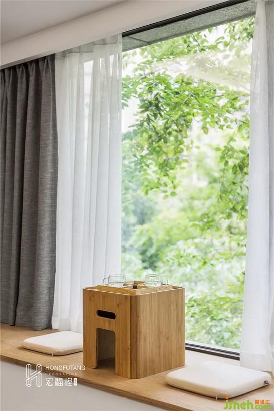客廳右側(cè)作為主要采光區(qū)域,利用榻榻米樣式可以增添家人的互動(dòng)空間,日??勺鳛樾∨笥淹鏄穮^(qū)角和休閑品茗空間。