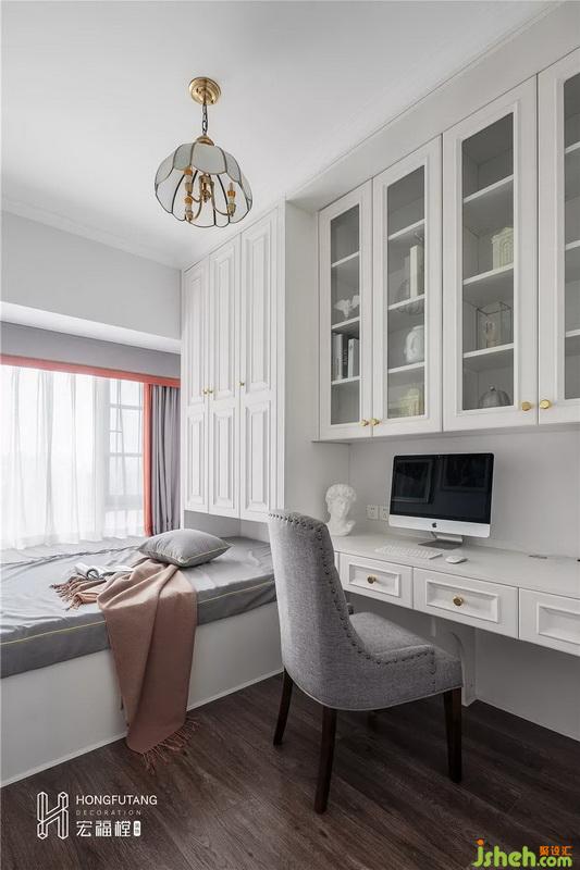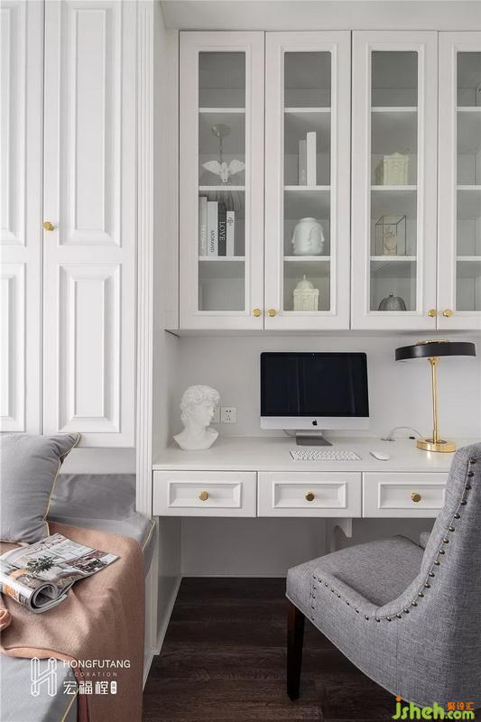 書房室內(nèi)設(shè)計師選用一體式家具,利用家具的自然線條,將每個功能區(qū)進行明確的分隔。書房靠窗位置,室內(nèi)設(shè)計師采用榻榻米樣式,一是可以滿足業(yè)主工作之余,偶爾放松小休,二能滿足基本客人留宿,三是利用榻榻米靠墻空間作為收納區(qū),可收納不常用大件物品。右側(cè)上方做成書籍收納區(qū)和擺件展示區(qū),下方設(shè)立書桌,可滿足日常辦公或小孩學(xué)習(xí)的需求。整個書房成了收納性最強的空間。