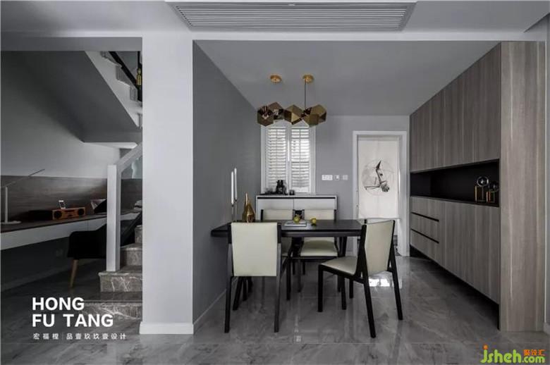 餐廳在一層,設(shè)計(jì)師將餐廳挑高2.5米,考慮到空間儲(chǔ)物功能,餐廳右側(cè)設(shè)立與客廳電視墻同色系儲(chǔ)物柜;餐廳桌椅選擇上,為協(xié)調(diào)整個(gè)空間的色調(diào),選用黑白色系,搭配金屬色燈具、燭臺(tái),穩(wěn)住了空間的氣場(chǎng)。