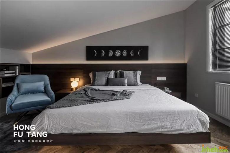 主臥位于二層,臥室地面用了豐富的人字拼地板,為單一的黑白灰基調(diào)豐富了色彩,整個(gè)空間因木質(zhì)暖調(diào)而變得溫暖。