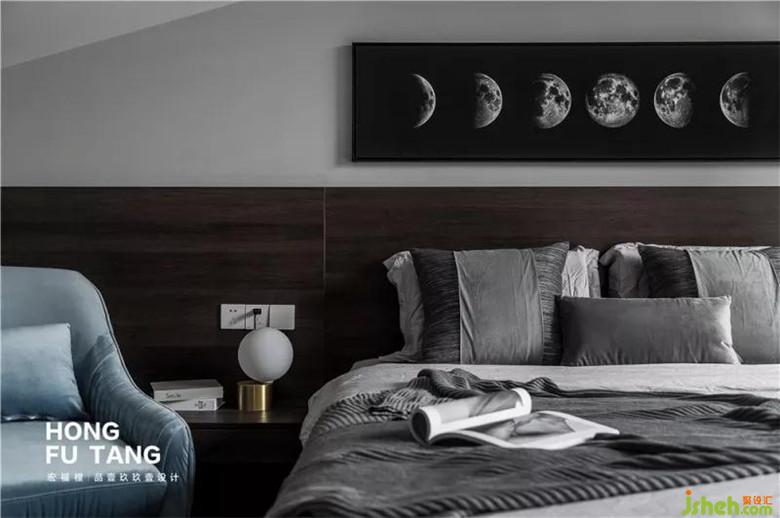 床頭空間低矮,為避免大片的留白,采用橫向月食圖,作為床頭壁畫(huà),陰晴圓缺都是人生百態(tài)。