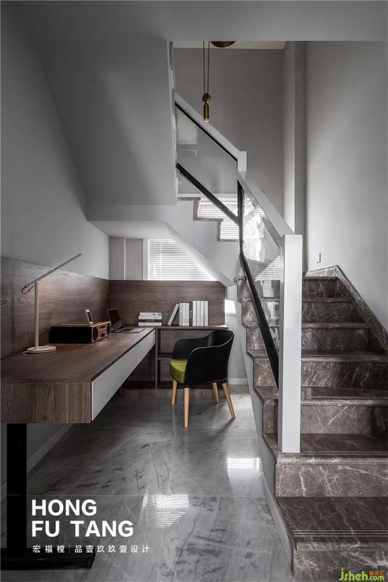 因?yàn)樵鎏硗ㄍ又髋P的樓梯,利用樓梯間的區(qū)域做成工作區(qū),便于上下樓的同時(shí),也有效地利用了空間;工作區(qū)桌子選擇儲(chǔ)物柜同色系,保持了整個(gè)空間色彩高度統(tǒng)一,利用原本右側(cè)窗戶,保證充足的光源。