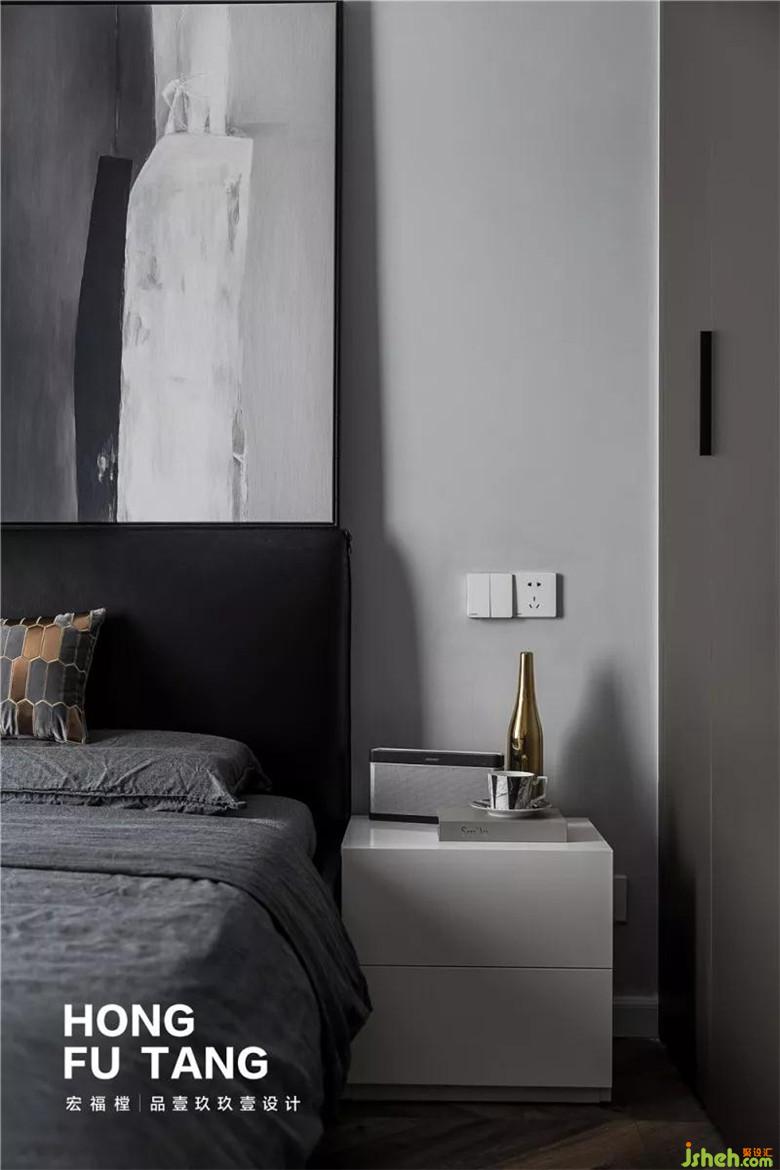一層主臥風(fēng)床頭采用黑色,床頭柜選擇白色,搭配灰色床單裝飾,延續(xù)整體黑白灰色調(diào),采用金屬色擺件,形成家居視覺(jué)的焦點(diǎn),平衡深色系空間的冷清感。