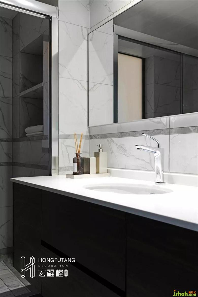 在衛(wèi)生間的設(shè)計上,室內(nèi)設(shè)計師追求實用性,遵循上輕下重循序漸進的原則,用簡單大理石墻磚搭配白色臺面,以黑色柜子作為顏色沉淀,使得空間更加穩(wěn)重簡潔。