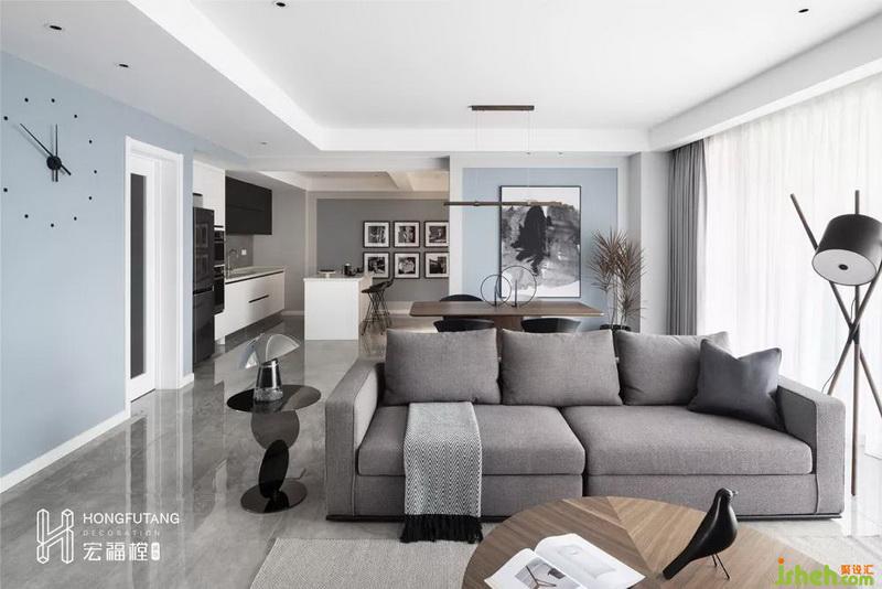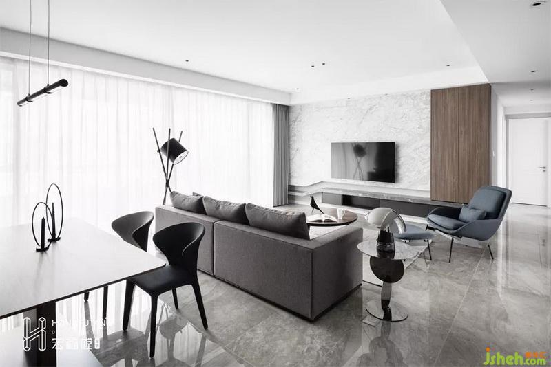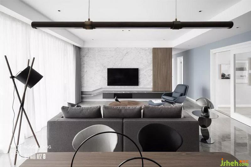 客廳與餐廳位于同一個(gè)空間內(nèi),依靠沙發(fā)背景自然分界,相互獨(dú)立,互不干擾。
