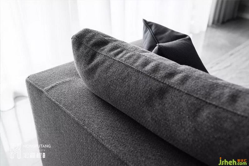 選用豆沙灰布藝沙發(fā),色彩搭配上與整個(gè)空間氣質(zhì)相符,從材質(zhì)上,肉眼可見的粗顆粒更有質(zhì)感。難得出現(xiàn)的暗色調(diào),強(qiáng)調(diào)空間視覺重心。