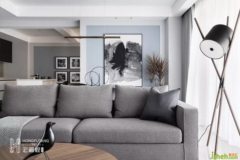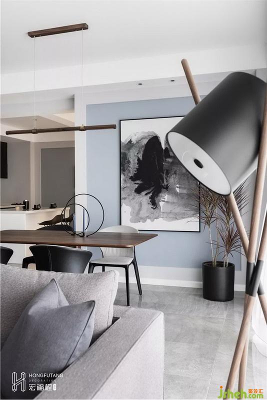 在沙發(fā)處搭配木質(zhì)落地?zé)?,補(bǔ)足了客廳休閑閱讀燈光和觀影的氛圍,兼做擺件出現(xiàn),與另一側(cè)邊幾呈對(duì)稱布局。