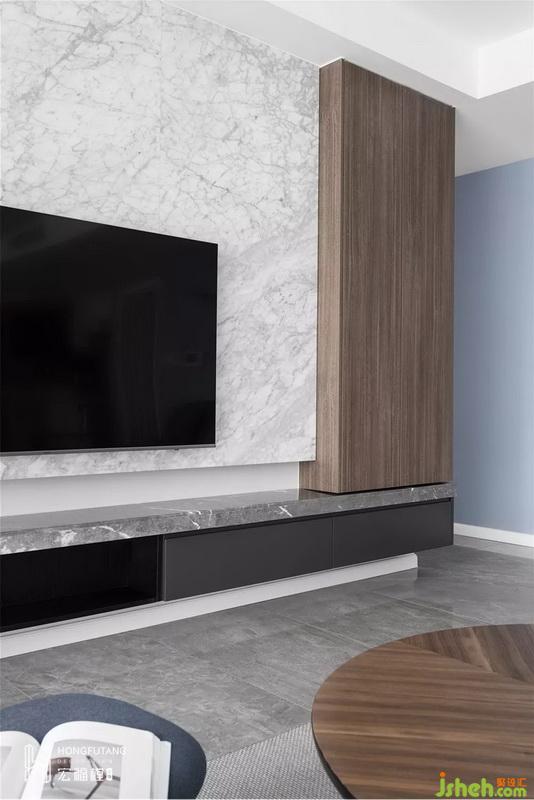 選用木質(zhì)包邊設(shè)計,電視墻質(zhì)感多元化,大理石和木質(zhì)搭配,利用自然紋理,空間線條感更強(qiáng)。