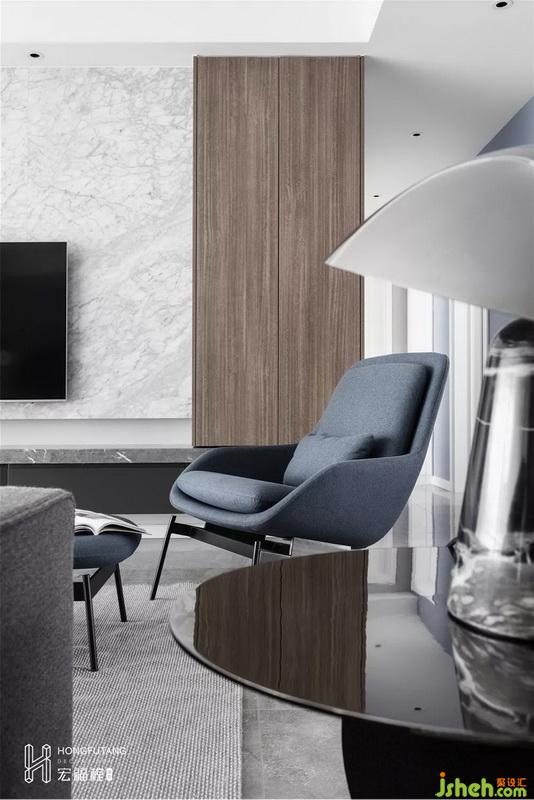 圓形茶幾不會占用太多的空間,木質(zhì)材質(zhì)的使用使得低明度冷色系的空間有了溫度,搭配地毯,帶來歸家的溫馨感??蛷d設(shè)立的躺椅也能滿足業(yè)主日常閱讀所需。